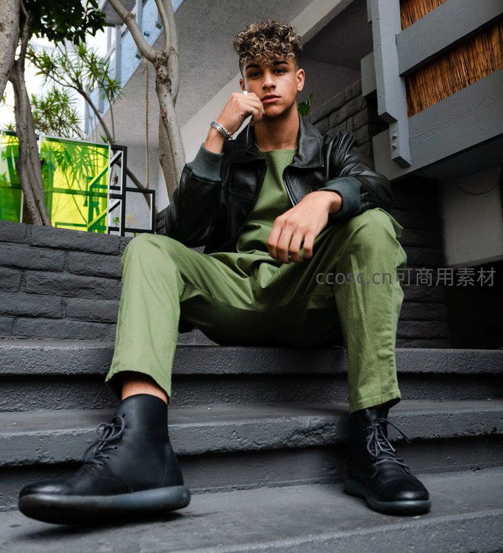 台阶上的休闲少年,皮夹克配军绿裤帅气有型