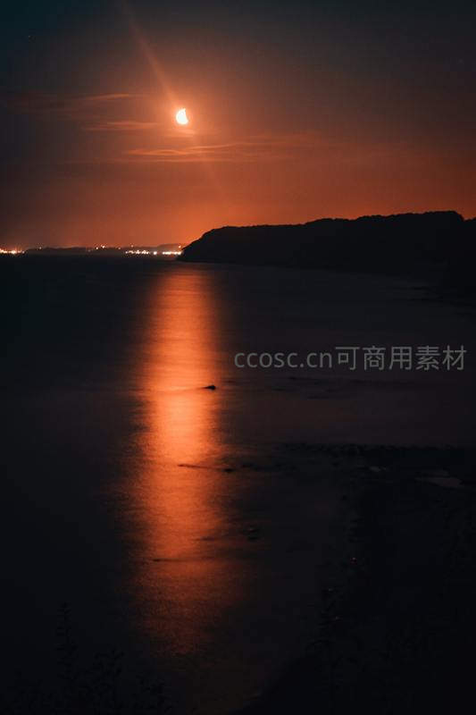 一轮血红色的月亮悬挂在夜空,其光芒在平静的海面上拉出长长的倒影,远处山峦与城市灯火勾勒出神秘轮廓。