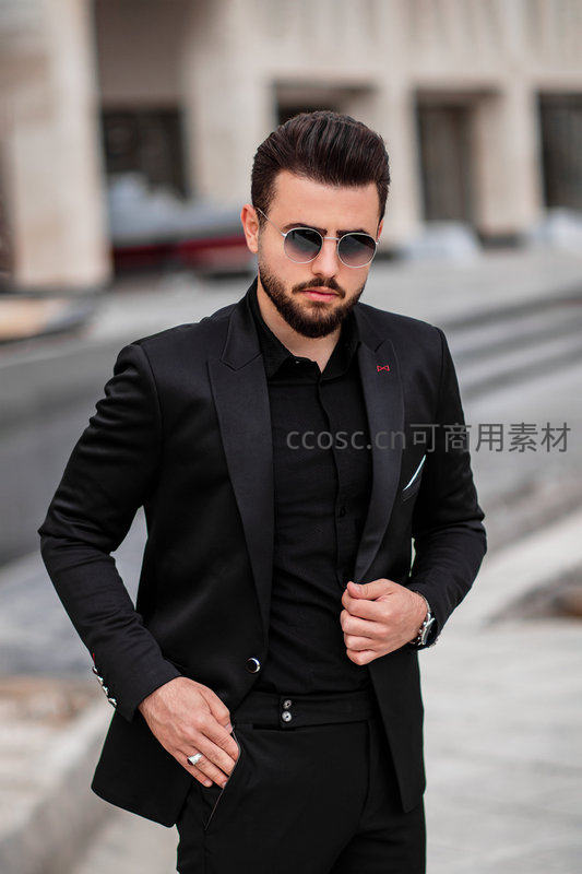 一位留着胡须的男士身着黑色西装,佩戴时尚墨镜,在城市街道背景下展现自信与魅力,尽显现代都市精英风范。