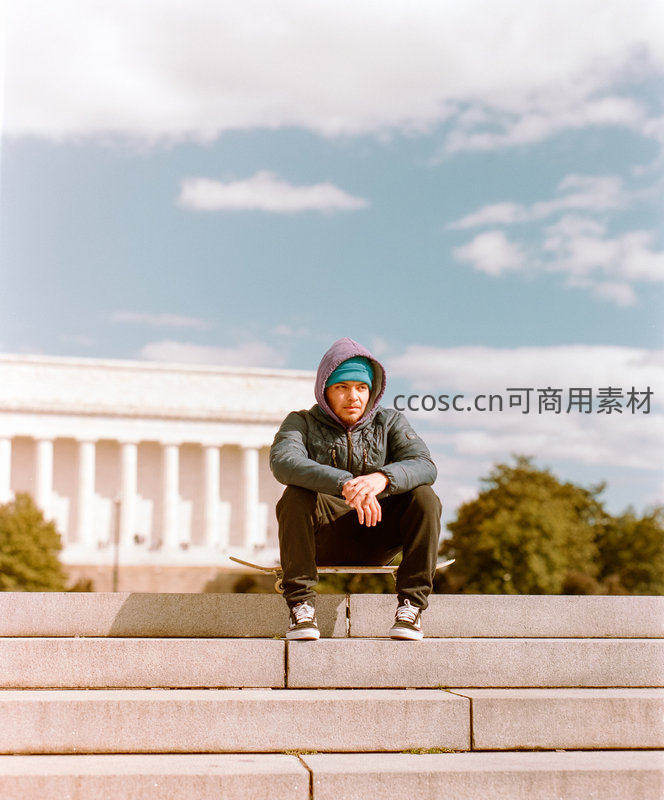 一位戴着帽子的年轻滑手坐在宽阔的石阶上,身后是宏伟的古典柱廊建筑,蓝天白云下展现出青春与沉思的瞬间。