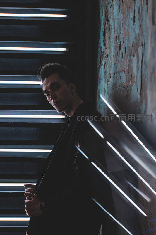 在充满线条感的霓虹灯光走廊里,一位年轻男子倚墙而立,冷峻侧颜与斑驳墙面形成强烈对比,散发出神秘而前卫的时尚气息。