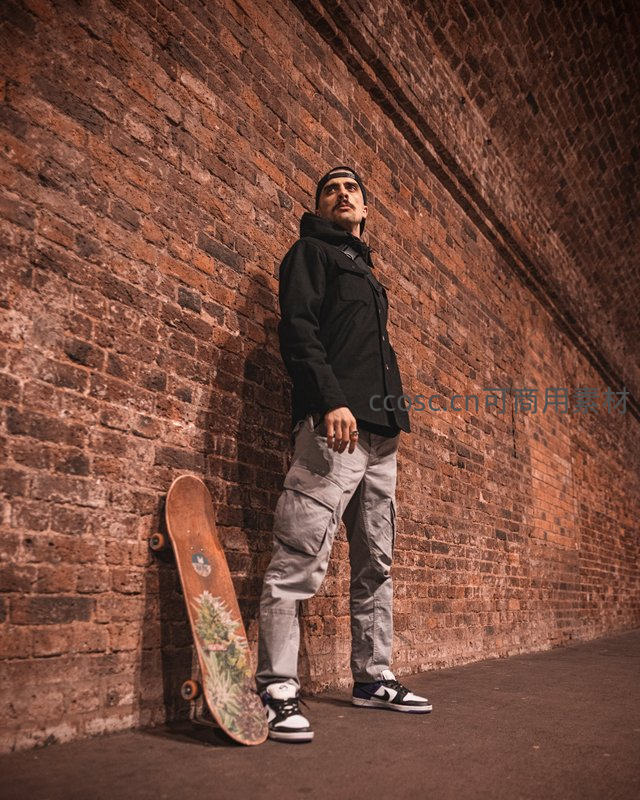 一位年轻男子身着黑色夹克与工装裤,斜靠在斑驳的红砖墙边,脚边立着一块涂鸦滑板,展现出浓郁的街头潮流风格。