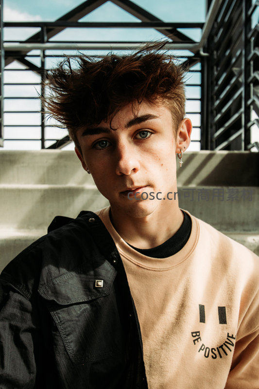 一位年轻男孩站在户外金属楼梯旁,阳光洒在他的发梢与脸上,眼神深邃,身穿印有“BE POSITIVE”字样的T恤,充满青春活力。
