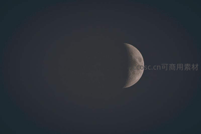 在无垠的深蓝色夜幕中,一弯清晰的新月独自闪耀,其表面纹理隐约可见,传递出宇宙的浩瀚与静谧。