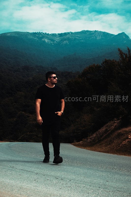 山间公路漫步的时尚男子