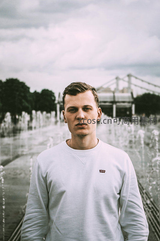 一位年轻男子身穿白色卫衣,站在喷泉广场中央,背景是模糊的拱桥和阴云密布的天空,整体氛围宁静而略带忧郁。