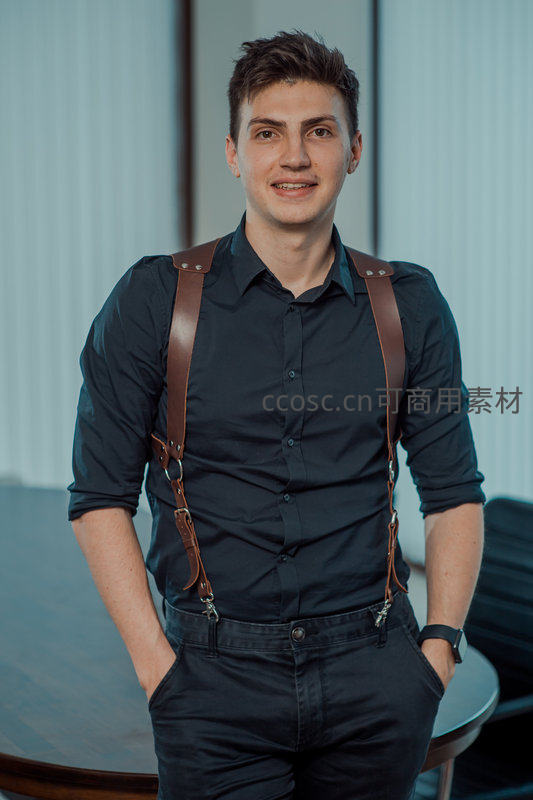 一位穿着深色衬衫搭配棕色皮质背带的男士微笑着站立于现代办公空间内,双手插兜,散发出干练又不失亲和力的气质。