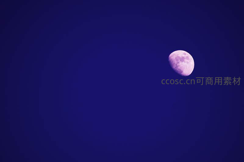 一轮散发着柔和粉紫色光芒的月亮悬浮在纯净的深蓝色天幕之上,色彩对比强烈,营造出如梦似幻的视觉效果。