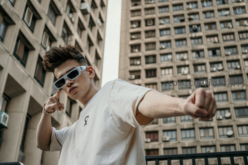 一位年轻男子在高楼林立的城市背景下摆出酷炫姿势,白色T恤搭配前卫墨镜,展现现代都市青年的自信与个性风格。