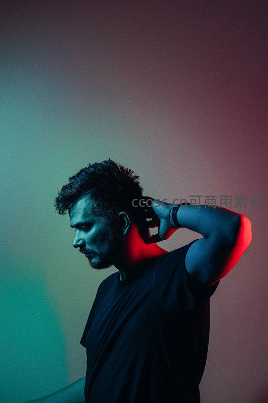 男子侧身站立于红蓝双色霓虹灯光下,手抚后颈,深色T恤与冷暖色调形成强烈对比,营造出充满戏剧张力与现代艺术感的视觉效果。