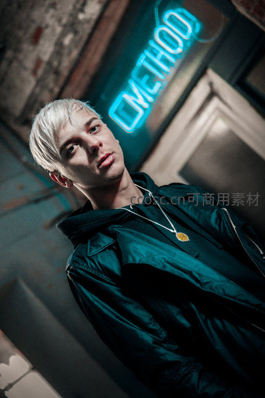 一位银发青年在蓝色霓虹灯背景下摆出酷炫姿势,身穿深绿色夹克,佩戴金色吊坠项链,展现街头潮流风格。