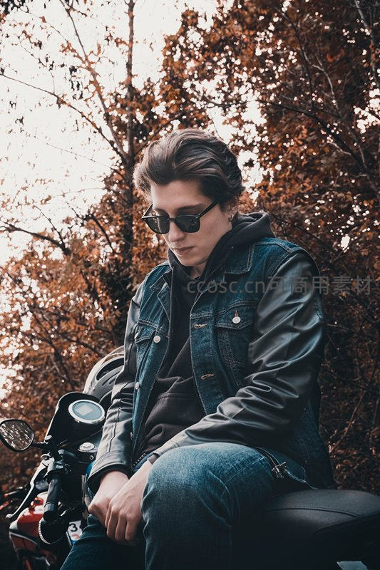 少年坐在摩托车上,身穿牛仔拼皮夹克,戴着墨镜,身后是金黄落叶的树林,营造出复古又自由的秋日氛围。