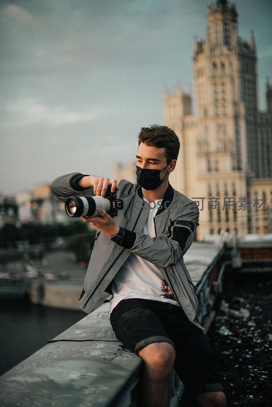 一位戴着黑色口罩的年轻摄影师,手持专业相机,在黄昏的城市天际线下专注地取景拍摄,背景是宏伟的古典风格高楼。