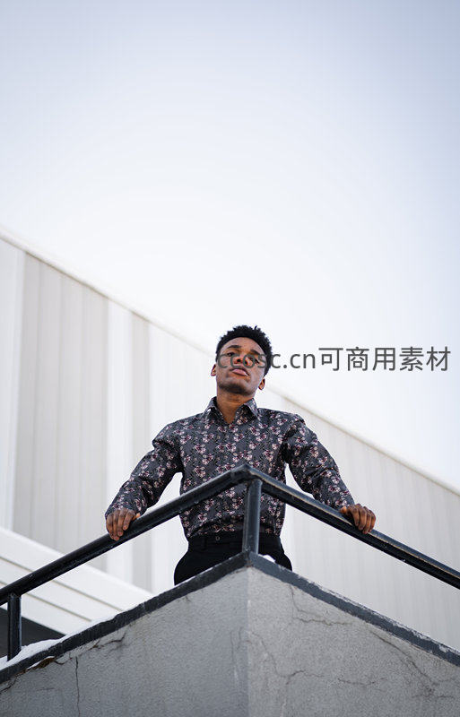 从低角度仰拍一位穿着印花衬衫的青年站在现代建筑阳台栏杆后,背景是简洁的墙面和天空,彰显青春与自信。