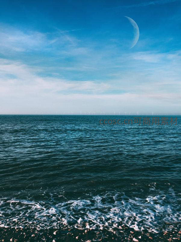 一弯新月高悬在蔚蓝海天之间,近处海浪拍打着礁石,远方海平线上隐约可见风力发电机阵列。