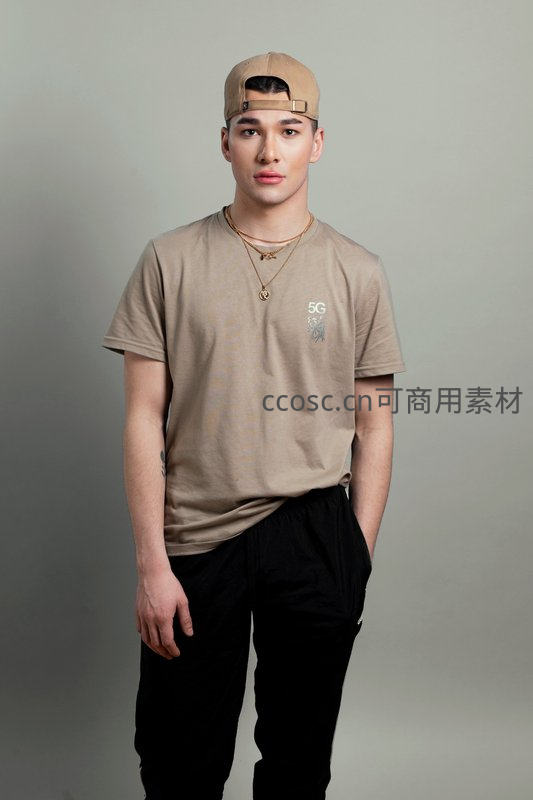 一位穿着米色T恤与黑色长裤的青年戴着反戴棒球帽,佩戴金色项链,表情平静地直视镜头,背景干净简洁,凸显现代简约风格。