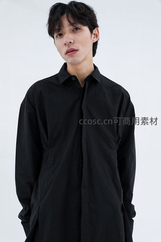 身穿宽松黑色衬衫的青年站在纯白色背景前,双手插兜,眼神专注凝视镜头,整体构图极简,突出人物情绪与服装质感的对比。