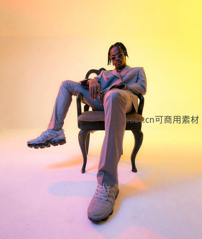 一位穿着灰色西装、戴着墨镜的男士坐在复古椅子上,背景是柔和的渐变色灯光,展现出独特的时尚感和自信姿态。