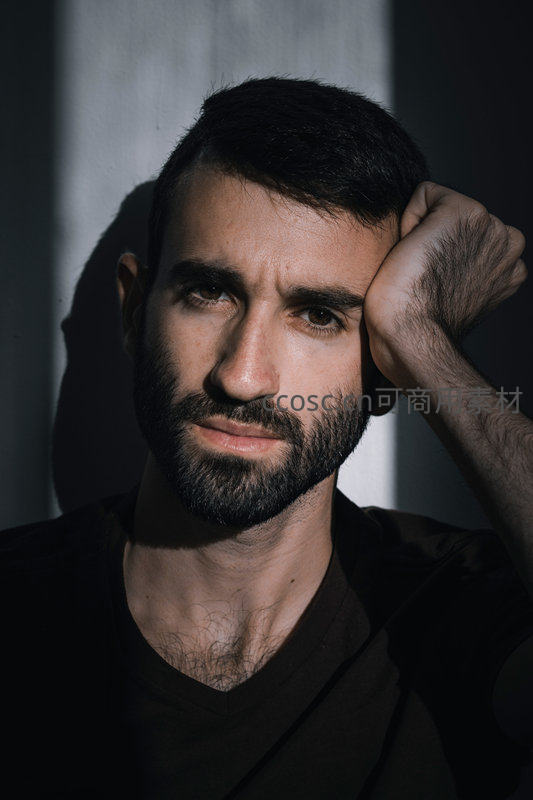 一位蓄着浓密胡须的男子在明暗对比强烈的光线下凝视镜头,手托脸颊,神情深邃而内敛,充满艺术感与情绪张力。