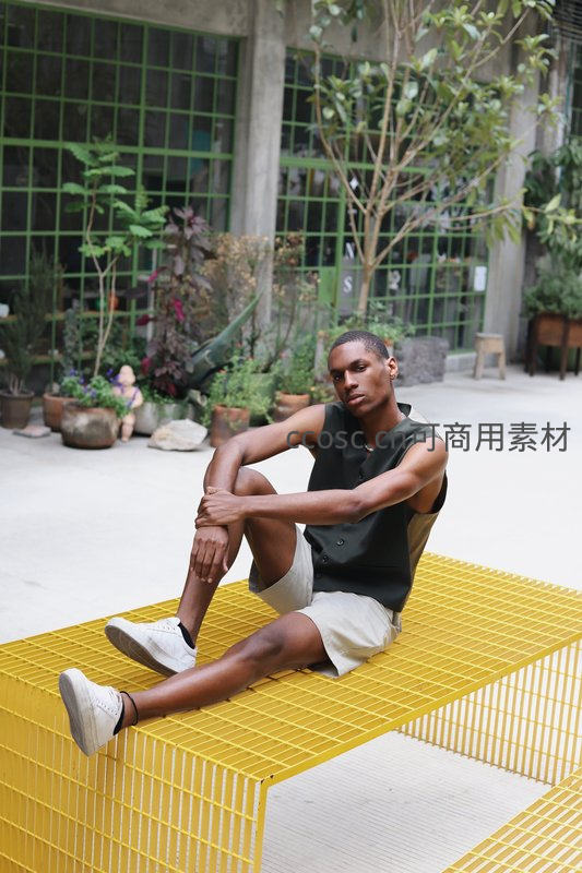 一位黑人青年坐在明亮的黄色金属网格长凳上,背景是工业风建筑与绿植环绕的庭院,展现出都市时尚与自然融合的氛围。