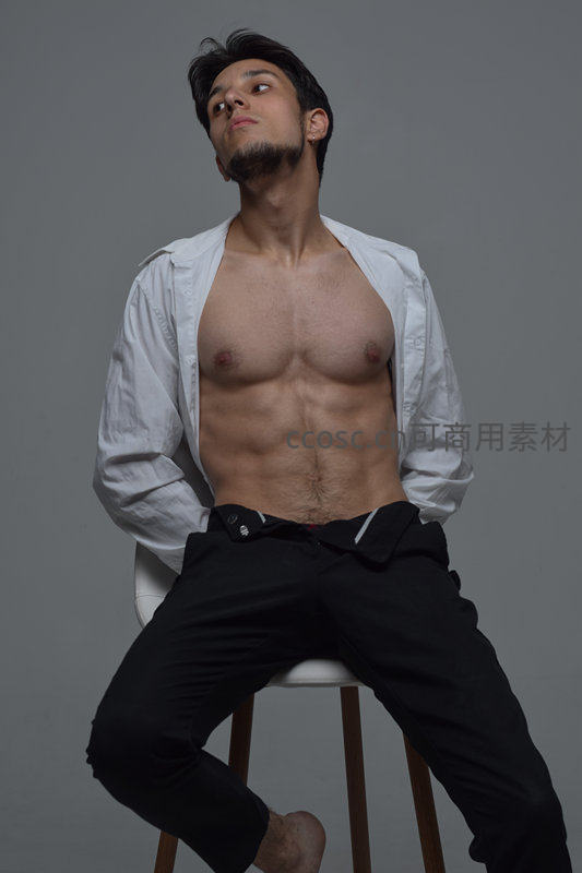 一名健硕男子敞开白衬衫,露出清晰的六块腹肌,坐在白色高脚凳上抬头凝望,背景为纯灰色,凸显力量与优雅的结合。
