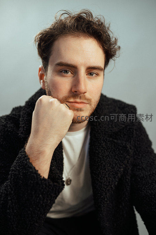 卷发男子身着黑色绒毛外套,手托下巴,目光平静直视镜头,背景为纯净灰色,突出面部轮廓与深邃眼神,营造安静内省的氛围。