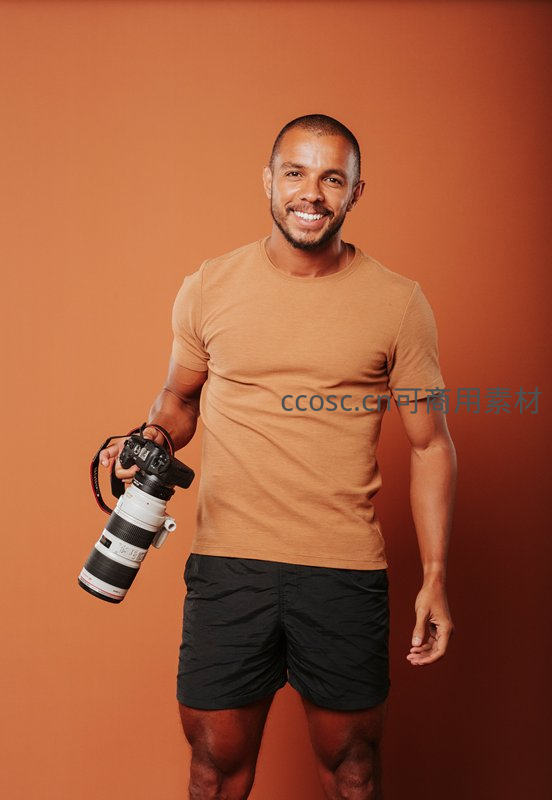 黑人男性摄影师身穿橙色T恤与黑色短裤,手持专业单反相机,面带灿烂笑容直视镜头,背景纯色温暖,传递热情与职业自豪感。