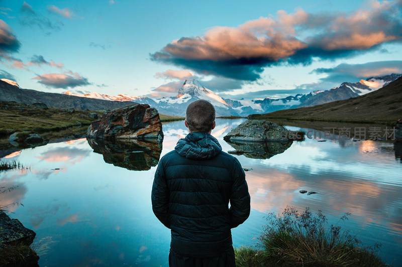 一名游客背对镜头,伫立在清澈如镜的湖边,凝视前方被夕阳染红的巍峨雪山。水面完美倒映着天空与山峦,构成一幅壮丽的自然画卷。