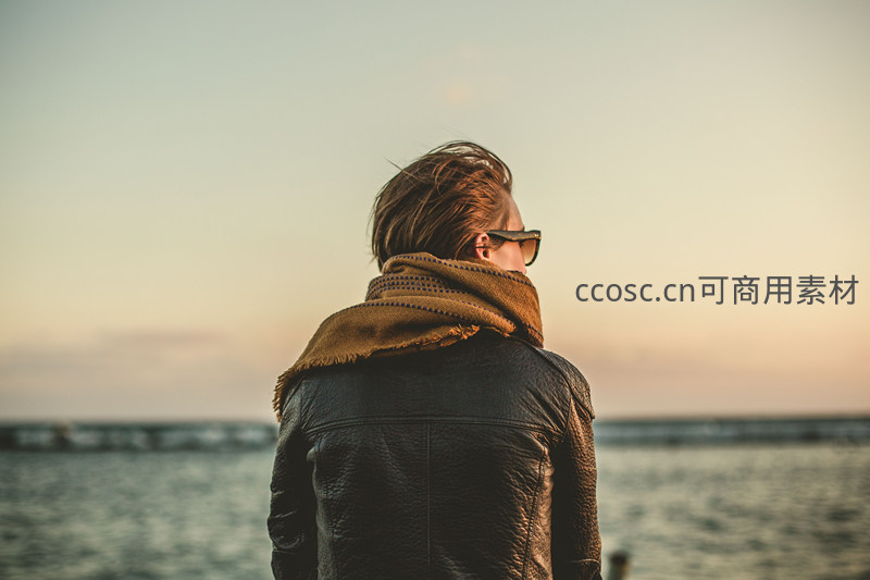 一位穿着皮衣、围着围巾的人站在海边,凝视着远方的落日,海风轻拂,画面传递出一种都市人向往的宁静与思考。