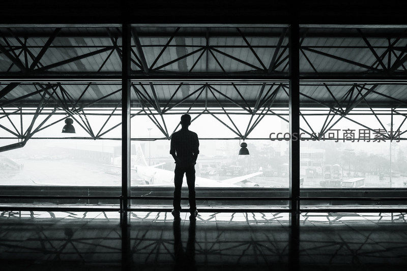 一位旅客独自站在机场大厅巨大的玻璃窗前,身影被逆光勾勒成剪影,窗外停机坪上的飞机隐约可见,充满旅途的孤独感。