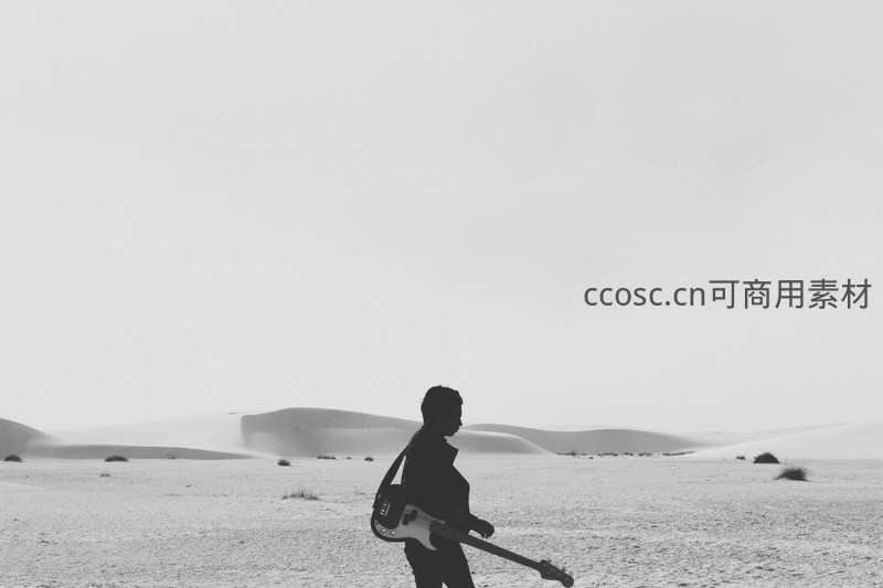 黑白影像中,一个身影背着吉他独自穿行于无垠的沙丘之间,强烈的明暗对比与空旷背景,凸显了旅途中的孤独感与艺术气息。