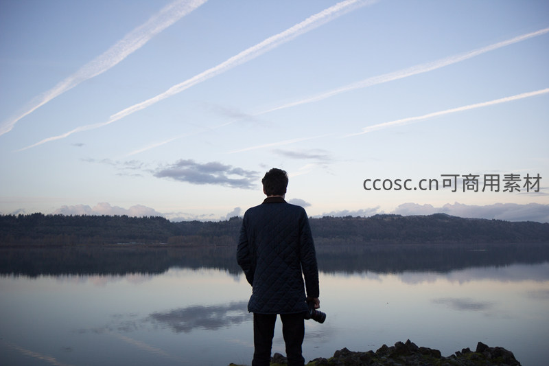 一位摄影师背对镜头,手持相机伫立在静谧的湖边,凝视着天空中交错的飞机航迹,水面倒映着天空与远山,意境悠远。