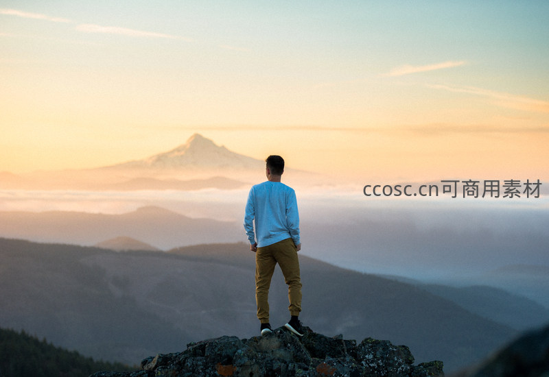 男子站在山巅,俯瞰脚下翻腾的云海与远处被霞光染红的雪山,展现征服自然后的宁静与壮阔之感。
