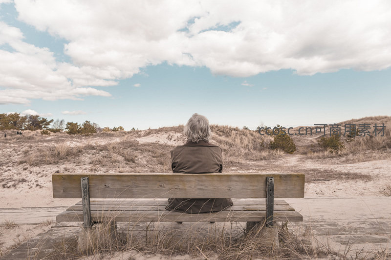 一位白发老人独自坐在海边沙丘的木制长椅上,背对镜头凝望远方,天空云卷云舒,营造出孤独而宁静的氛围。
