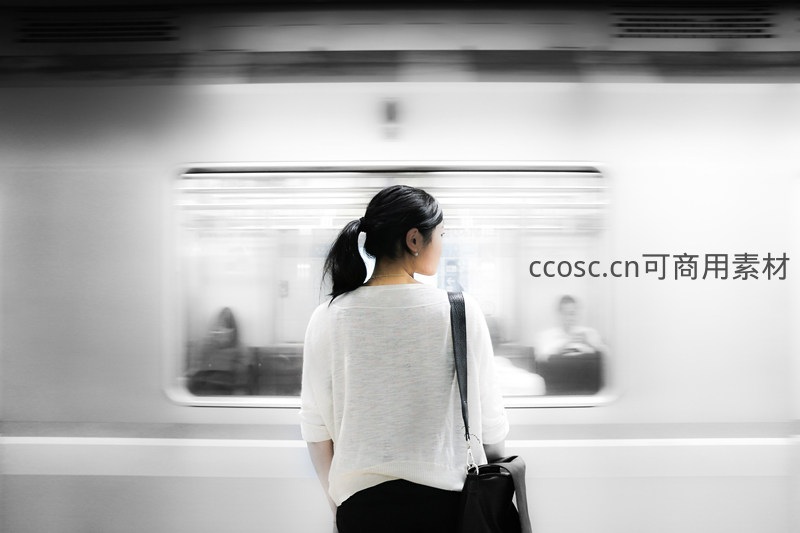 一名女子站在地铁站台,背对镜头注视着飞驰而过的列车,车厢内乘客模糊不清,画面充满都市生活的匆忙与疏离感。