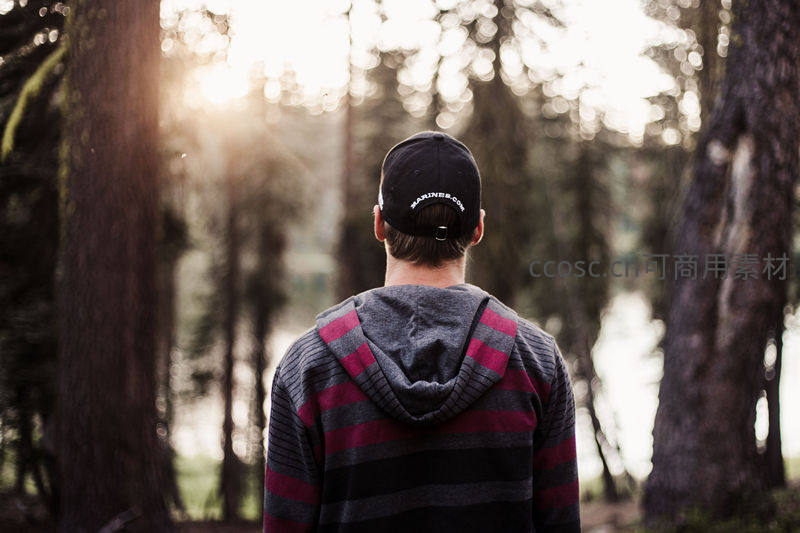 一位青年背对镜头,身穿条纹帽衫站在茂密森林中,阳光从树冠缝隙洒下,营造出温暖而静谧的氛围,仿佛在沉思或享受独处时光。
