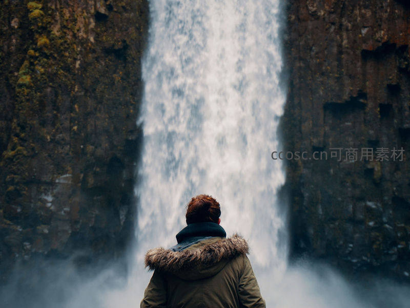 旅人驻足仰望磅礴瀑布水雾弥漫