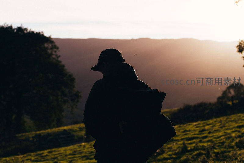 夕阳余晖洒满山坡,一人背着行囊缓步前行,身影被拉长成剪影,与起伏的绿色田野和远处山峦构成诗意黄昏图景。