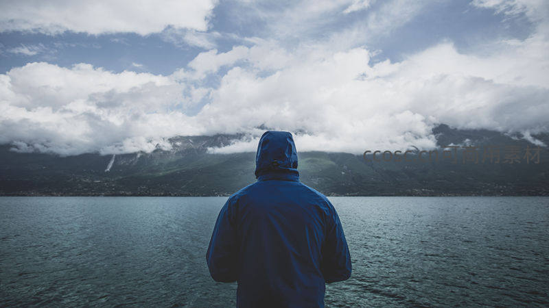 身着蓝色雨衣的人静立湖边,远眺被云雾半掩的青翠山峦,湖面平静如镜,营造出一种静谧而略带神秘的氛围。