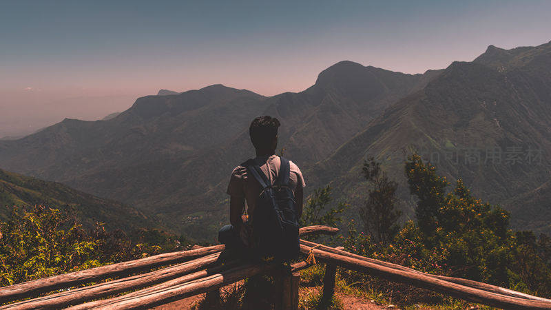 一位背着背包的旅人坐在山顶木栏旁,凝视着眼前层峦叠嶂的绿色山脉。晨曦或暮色中的薄雾为山谷增添了一丝神秘与宁静,是探索自然与内心平和的完美写照。