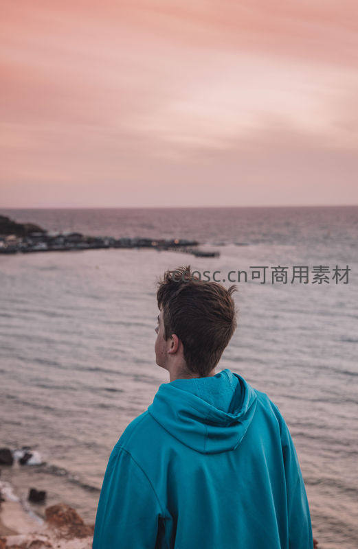 少年面朝大海,粉霞染红天际