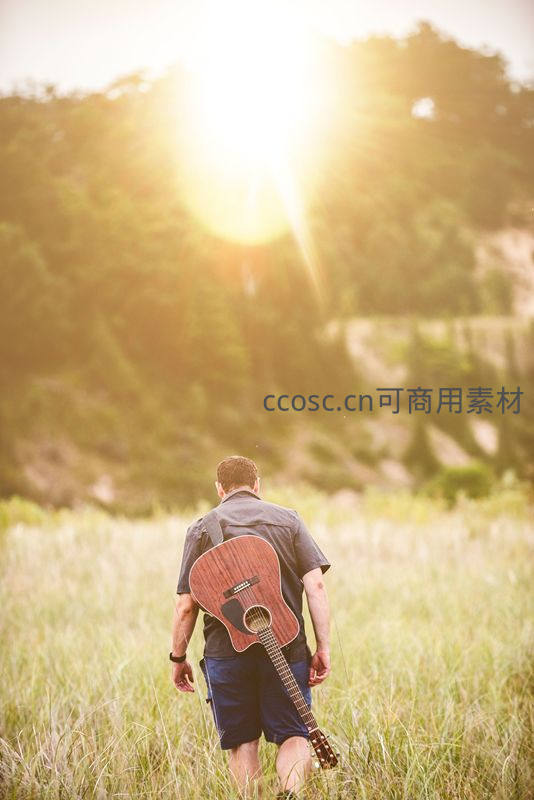 一位男子背着木吉他,在金色夕阳照耀的草地上缓步前行,远处山林朦胧,画面充满诗意与自由感。