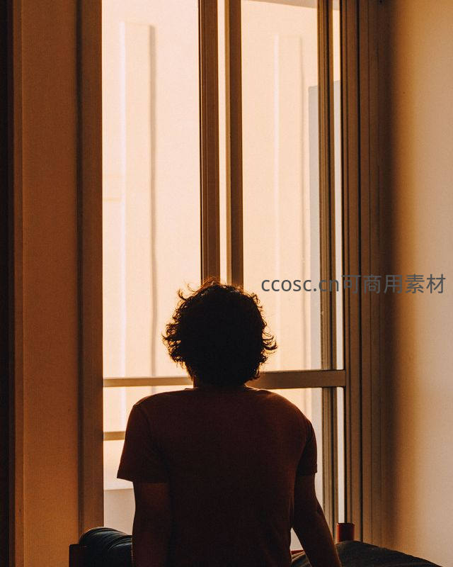 窗前剪影,卷发青年沐浴暖阳沉思冥想