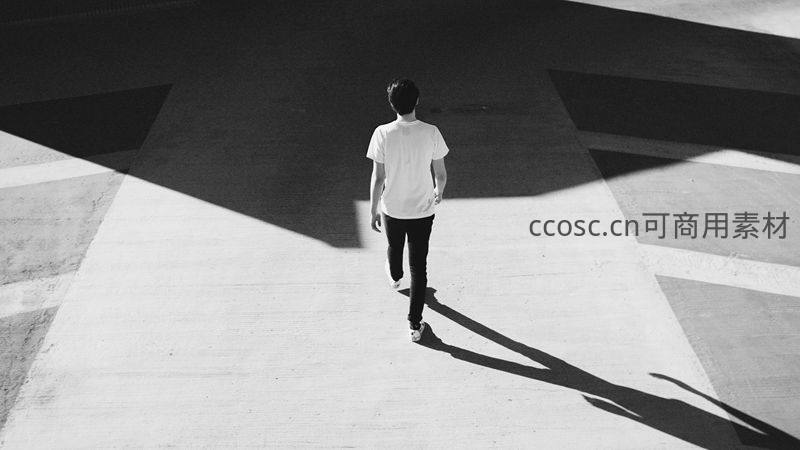 一人在强烈的明暗对比下行走,地面几何线条与拉长的影子构成视觉焦点,传递出孤独与前行的意境。