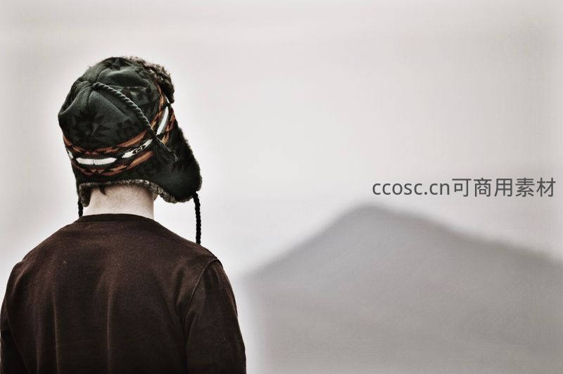 戴毛帽男子远眺朦胧山景