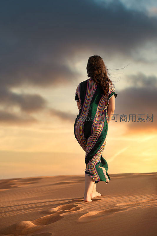 女子身着条纹长裙赤足行于金色沙丘之上,身后留下串串脚印,晚霞漫天,风吹发丝,勾勒出自由与诗意的旅程。