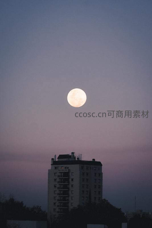 一轮圆月温柔地悬挂在城市高楼之上,天空被染成梦幻的紫蓝色,构成一幅宁静祥和的都市夜景图。