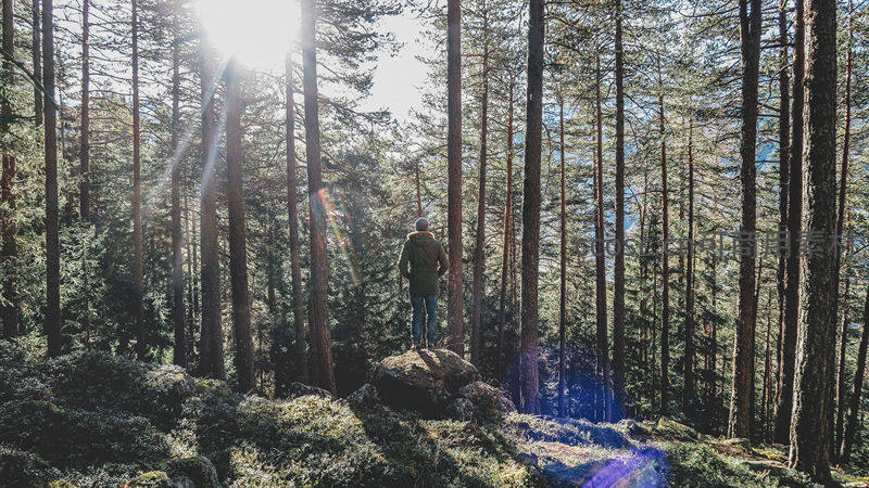 一人伫立林间岩石之上,阳光穿透高耸松树洒下斑驳光束,营造出静谧而神圣的氛围,展现人与自然和谐共处的瞬间。
