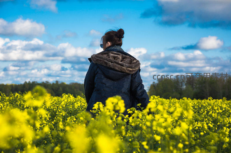 一位女子穿行于金黄油菜花海中,头顶蓝天白云,衣领毛绒温暖,背影融入自然色彩,展现春日田园的诗意与惬意生活。