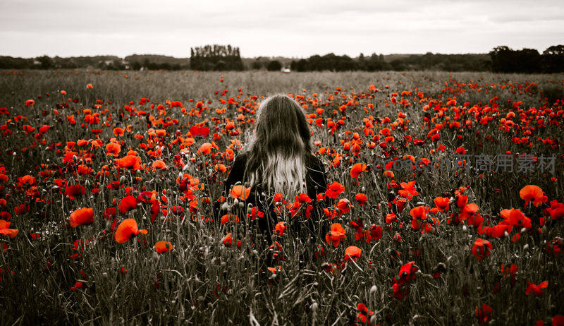 一位长发女子背对镜头,伫立在一片鲜艳的红色罂粟花田中,黑白背景衬托出花朵的浓烈色彩,营造出静谧而富有诗意的氛围。